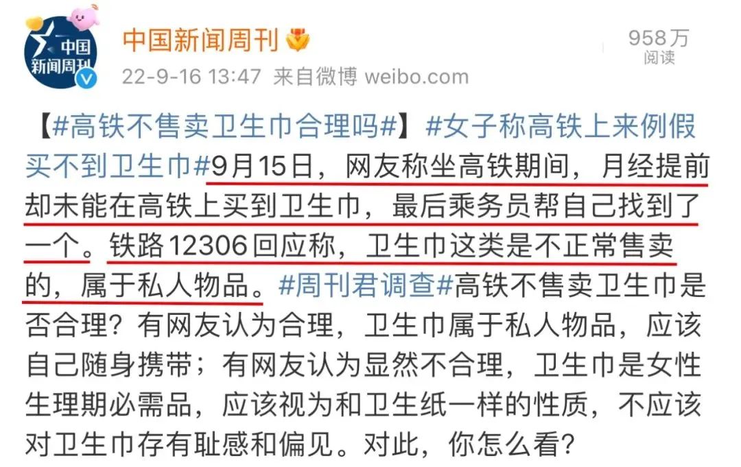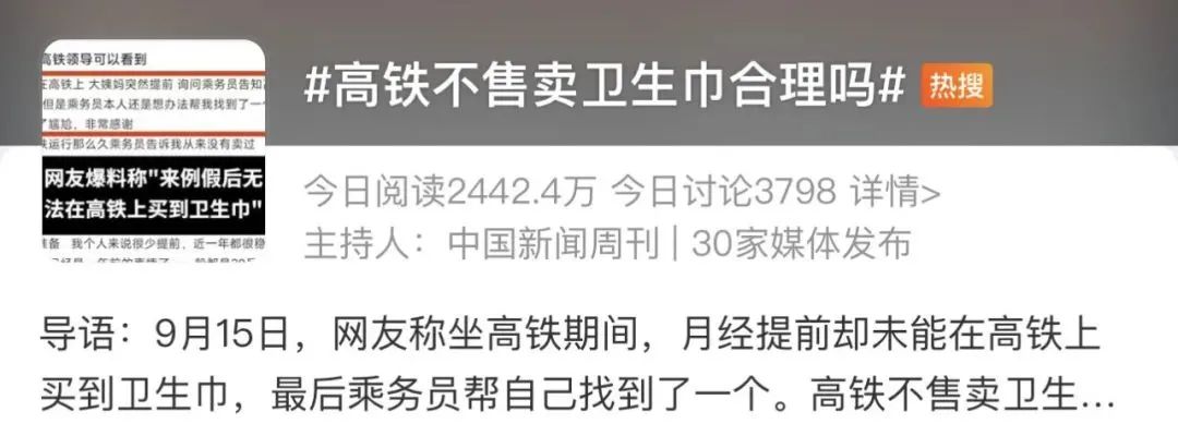 然而時隔整整一個月后,在2022年的9月15日,“高鐵不售賣衛(wèi)生巾”的詞條沖上中國微博熱搜。