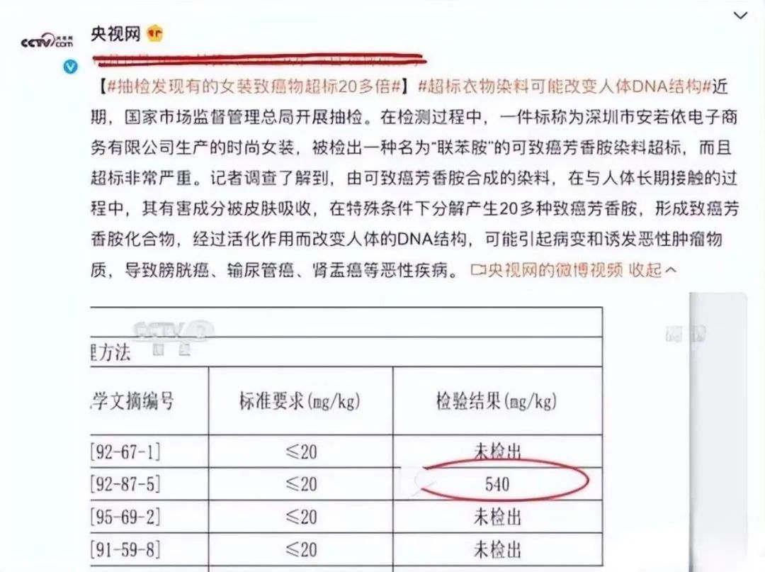 央視網(wǎng)曾報道,國家市場監(jiān)督管理總局抽檢過程中發(fā)現(xiàn),一種名為“聯(lián)苯胺”的可致癌芳香胺染料,出現(xiàn)在時尚女裝中,并且大量超標。而這種有害成分被人體吸收后,經(jīng)過活化作用,甚至可以改變?nèi)梭w的DNA結(jié)構(gòu)!