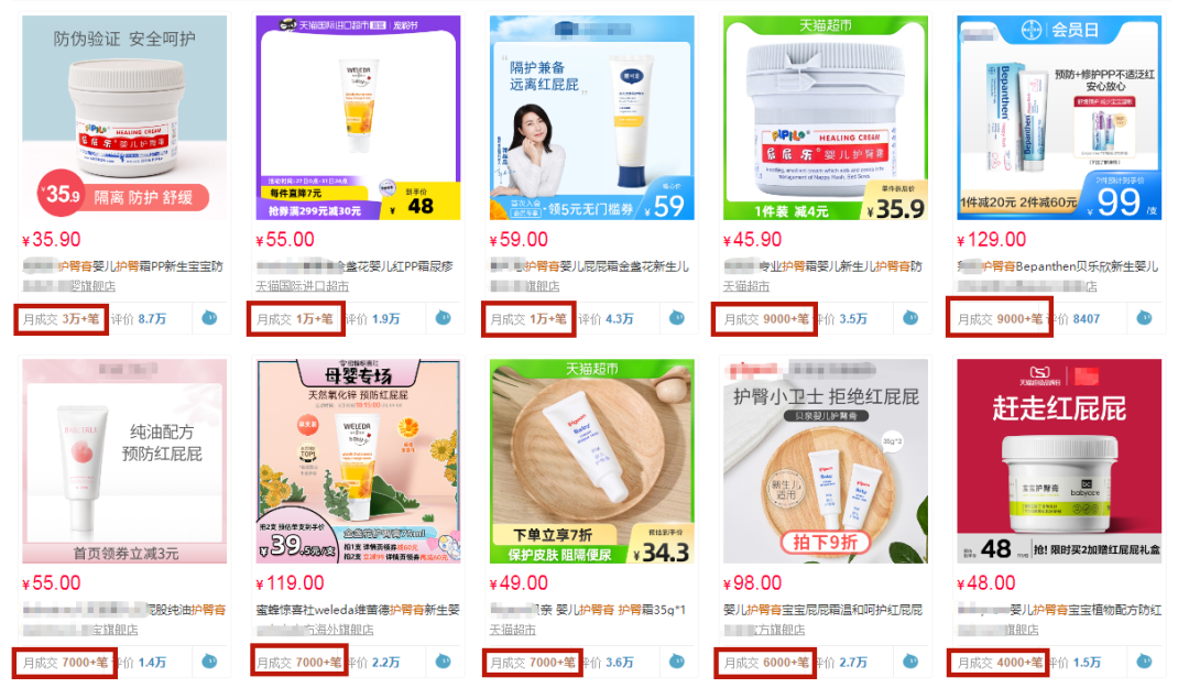 在網(wǎng)購平臺搜索“嬰兒護臀膏”,月銷量最高3萬,排名第10的產(chǎn)品也有月銷4000。這還是非大促時候的銷量。