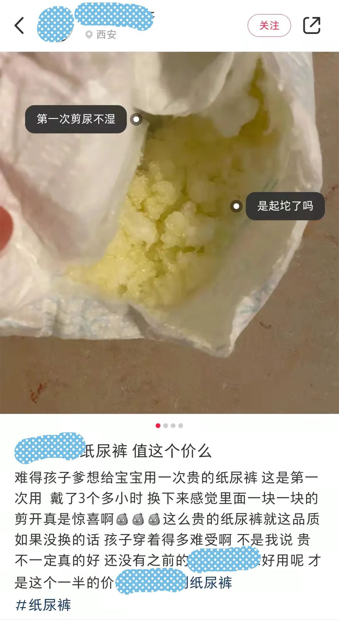 某平臺上,一位新手媽媽購買了市面上一款知名品牌紙尿褲,結(jié)果剪開以后發(fā)現(xiàn)芯體明顯起坨,形成了一個個大小不一的水塊。