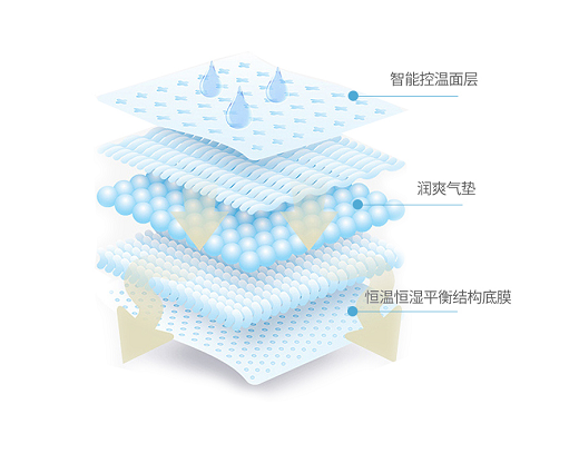 歐阿咦哦的復(fù)合芯體,能夠遇水膨脹,形成快速導(dǎo)流通道與空氣對流通道,與智能潤感植物纖維面層、恒溫恒濕底膜一起打造Q彈氣囊結(jié)構(gòu)。