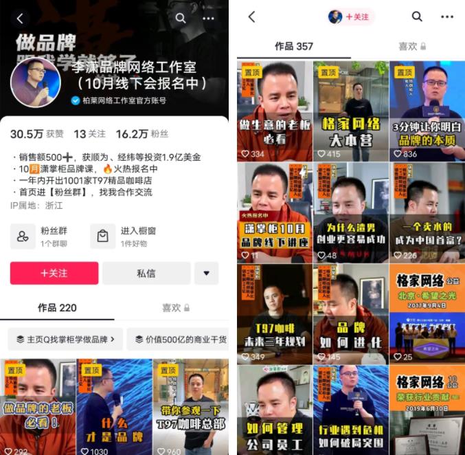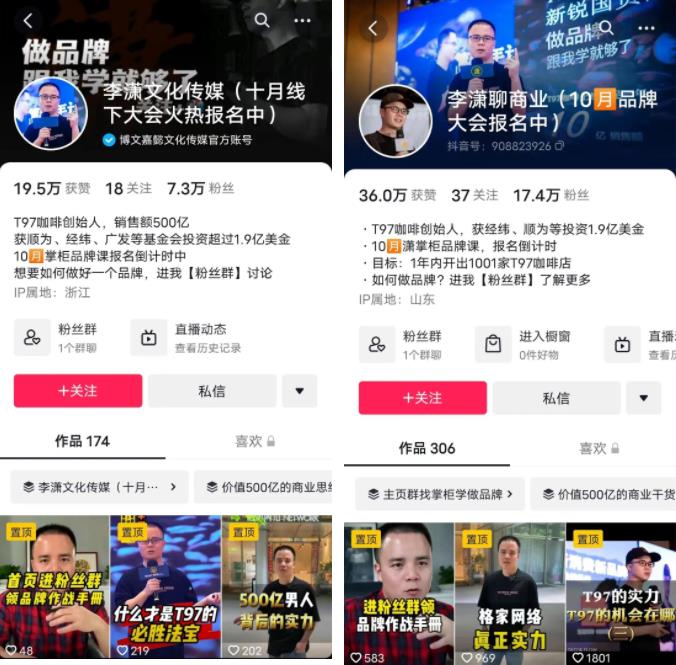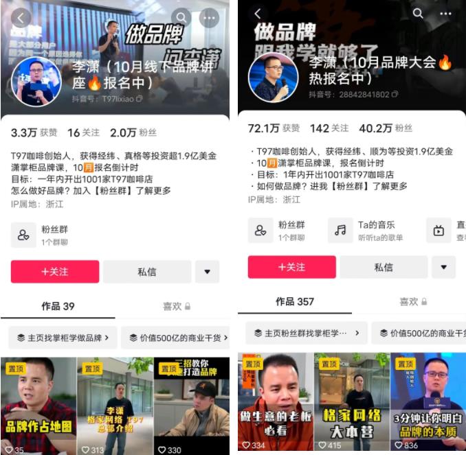 在自媒體矩陣中,“李瀟文化傳媒”、“李瀟”、“李瀟聊商業(yè)”、“李瀟品牌網(wǎng)絡(luò)工作室”等多個賬號均打出“做品牌,跟我學(xué)就夠了”的口號,并把T97咖啡作為成功案例,打造他的商業(yè)人設(shè)。