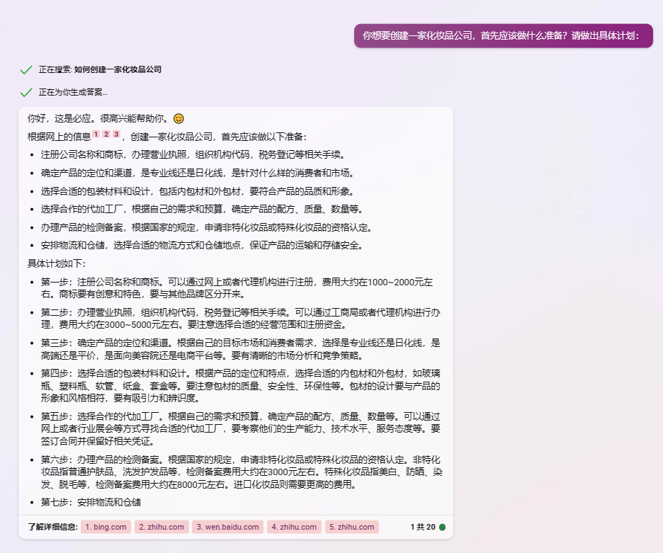 如圖所示,當(dāng)我拋出一個(gè)問(wèn)題,它會(huì)去各種互聯(lián)網(wǎng)的數(shù)據(jù)庫(kù)平臺(tái)上搜索整合,然后給出相應(yīng)的答案。