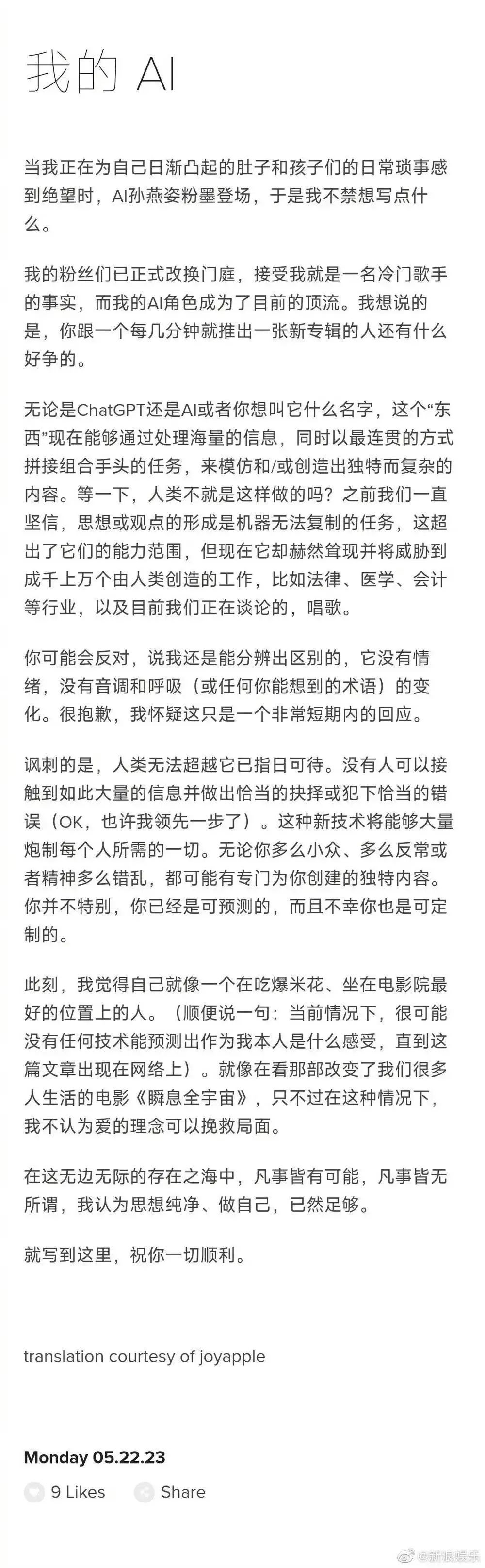 孫燕姿寫道:我的粉絲們已經(jīng)接受我就是一名“冷門歌手”的事實(shí),而我的AI角色成為了目前的頂流。我想說的是,你跟一個(gè)沒幾分鐘就推出一張新專輯的人還有什么好爭(zhēng)的。