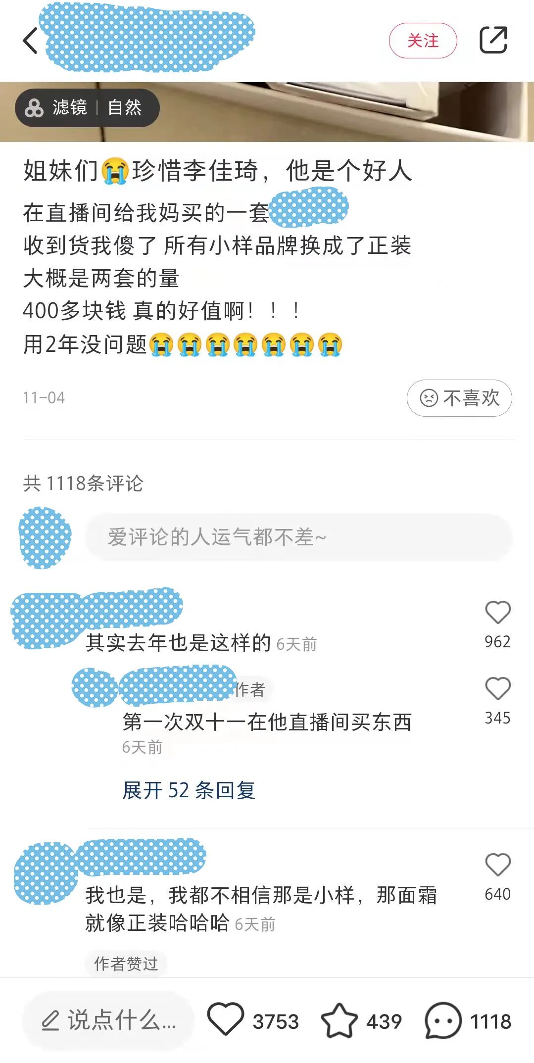 在某平臺上,顧客曬出在李佳琦直播間購買商品,小樣全部換成了正裝。有評論表示,李佳琦團隊會經(jīng)常和品牌方交涉這樣的事情,為粉絲爭取福利。