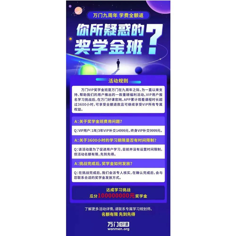 所謂的“獎(jiǎng)學(xué)金計(jì)劃”,是指VIP學(xué)員補(bǔ)交9999元和14999元加入獎(jiǎng)學(xué)金班,報(bào)名后賬號(hào)累計(jì)看課時(shí)長(zhǎng)達(dá)到3600小時(shí)后返還全部學(xué)費(fèi)。
